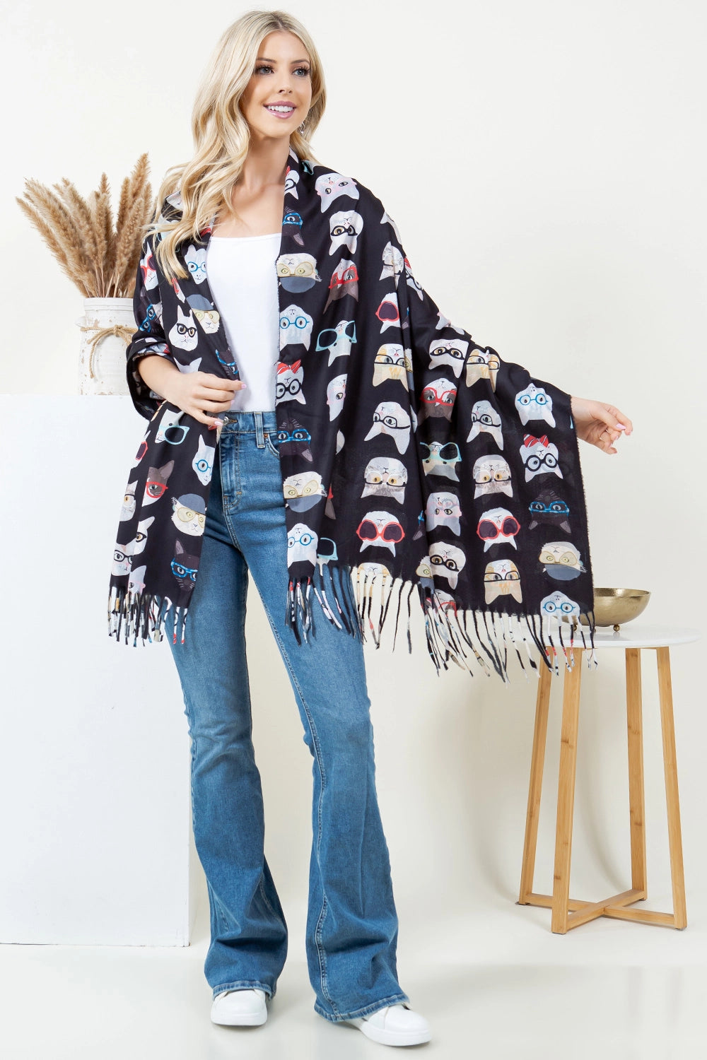 This exclusive and luxurious scarf features a cool cat design with a touch of sophistication, thanks to the glass detail. Stay warm and stylish with this cozy and fun scarf, perfect for the fall and winter months. Don't miss out on this essential addition to your wardrobe.