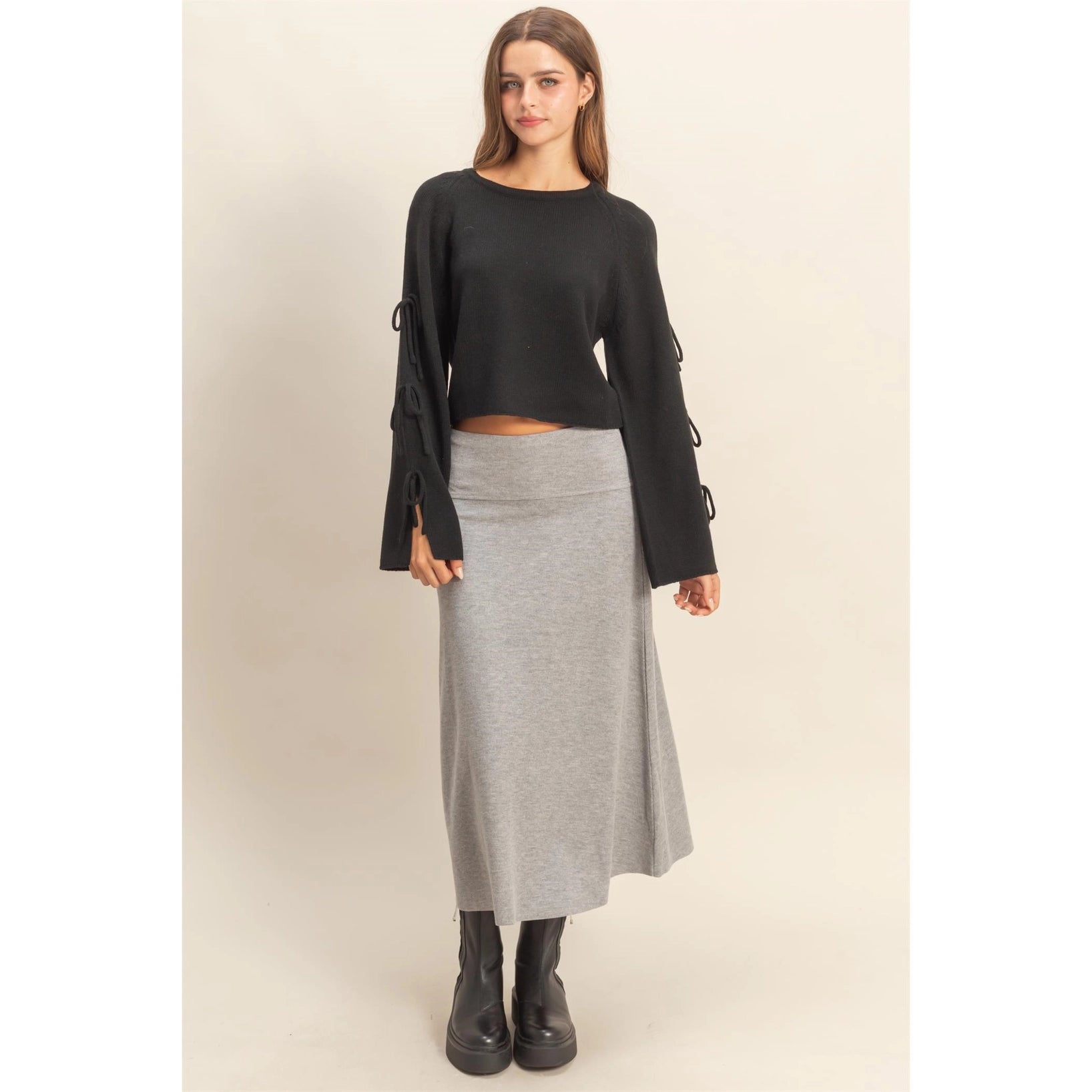 Embrace comfort and style with this mid-length knit skirt. Featuring a clean, flowing silhouette, it's perfect for versatile wear. Pair with a fitted top or a billowy blouse for a balanced look. Ideal for both a casual day out or a smart-casual environment, this skirt offers easy layering and can be accentuated with minimalistic accessories for a refined outfit. 55% polyester 30% rayon 11% nylon 4% spandex