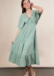 The Mineral Wash Dress features a mineral-washed fabric with an elastic neck detail for comfortable wear. Its asymmetrical tiered layers create a dynamic silhouette, complemented by short sleeves and a flattering V-neckline. Raw edge and shirring details add subtle texture and sophistication, making this midi dress a versatile choice for expert styling in any wardrobe.