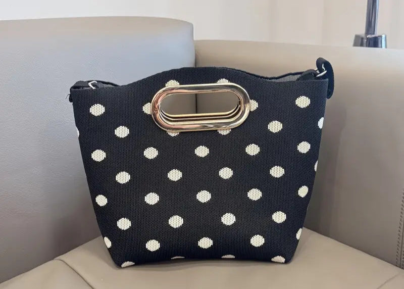 Elevate your everyday style with the Paris Polka Dot Handbag, featuring a sophisticated two-way knit construction that combines durability with a tactile, elegant finish. The playful polka dot pattern adds a touch of charm, while the secure metal clasp ensures your belongings stay safe. An adjustable strap offers versatile carrying options, making it ideal for casual outings or commuting. This handbag balances practicality and style, perfect for those who appreciate quality craftsmanship and timeless design in their daily accessories.