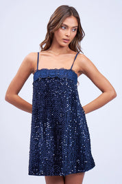 Get ready to shine in our Tobie Glitter Dress! This mini dress features a dazzling sequin print that will catch everyone's eye. The square neckline and sleeveless design are stylish and comfortable, while the lace trim adds a touch of delicate detail. Made with 100% polyester and a hint of stretch, this dress will keep you looking and feeling fabulous all night long.
