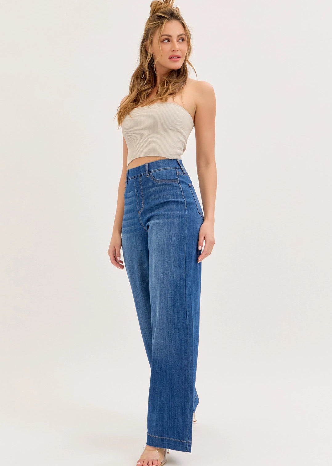 Wendy Wide Leg Jeans feature a timeless high-rise silhouette crafted from soft, flexible denim in a versatile medium wash. Designed with a wide-leg fit, they offer both comfort and a contemporary edge, making them an essential addition to any wardrobe for effortless style and ease of movement.